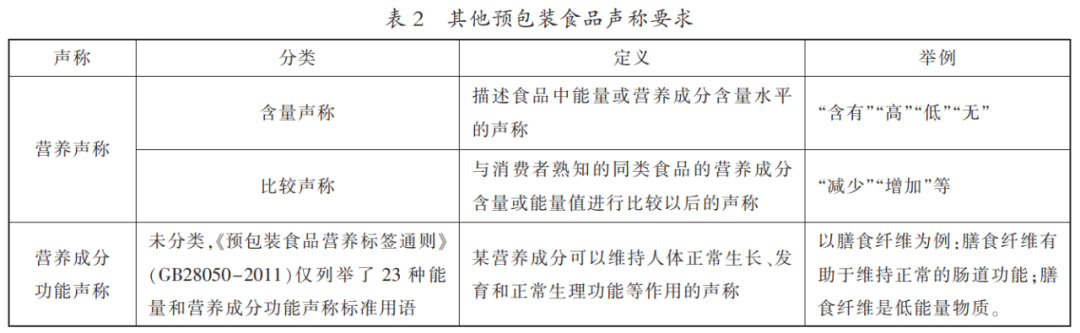 現(xiàn)階段,我國保健食品之外的其他食品僅允許營養(yǎng)含量聲稱和營養(yǎng)成分功能聲稱,其具體要求參見表1 和表 2。