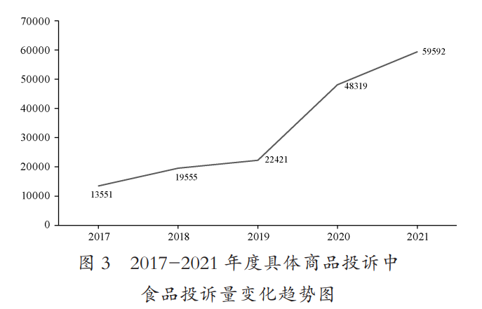 根據(jù)中國消費者協(xié)會官方網(wǎng)站數(shù)據(jù),對 2017- 2021 年間全國消協(xié)組織受理投訴情況中的商品和服務(wù)類別統(tǒng)計分析可知,按照商品大類維度分析(見圖2 ),食品類投訴數(shù)量由 2017 年的 20944 件增加到2021 年度的 77301 件,其在商品大類投訴中所占比重呈逐年上升趨勢,2020 年增速尤為顯著。食品類投訴案件數(shù)量排名從 2017 年最初的第 6 位升至 2021 年第 3 位。按照具體商品維度分析(見圖 3),食品投訴量由 2017 年度 13551 件增加至 2021 年度的59592 件,其中 2020 年度投訴案件同比增長115.51%。在此期間,食品投訴數(shù)量也在具體商品投訴排名中由2017 年最初的第 5 位升至 2021 年的第 1 位。