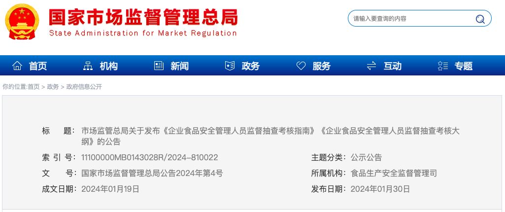 市場監(jiān)管總局關于發(fā)布《企業(yè)食品安全管理人員監(jiān)督抽查考核指南》《企業(yè)食品安全管理人員監(jiān)督抽查考核大綱》的公告