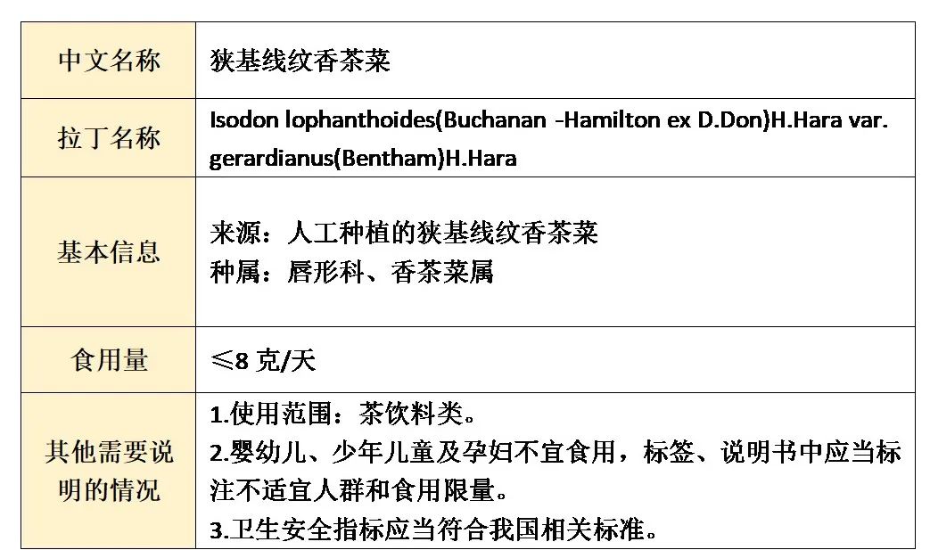 2013年第10號公告中批準(zhǔn)“狹基線紋香茶菜”,作為新食品原料用于茶飲料,推薦食用量為≤8克/天,嬰幼兒、少年兒童及孕婦不宜食用。2021年5月申報(bào)擴(kuò)大到代用茶。根據(jù)提供的食用歷史資料及安全性評估資料,同意擴(kuò)大到代用茶。建議終止審查,食品安全指標(biāo)按照以下內(nèi)容執(zhí)行:鉛(以Pb計(jì))≤2mg/kg;總砷(以As計(jì))≤0.5mg/kg;六六六≤0.02mg/kg;滴滴涕≤0.02mg/kg。