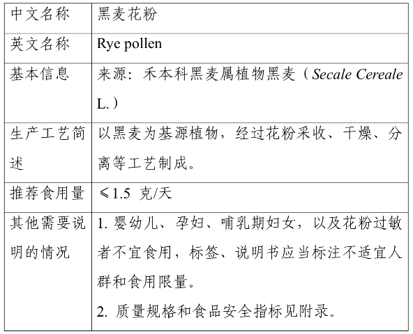 本產(chǎn)品的基源植物為禾本科黑麥屬植物黑麥(Secale Cereale L.),原產(chǎn)于中亞及地中海等地區(qū),在歐洲被廣泛種植。本產(chǎn)品是采收黑麥的花粉,經(jīng)過干燥、分離等工藝制成。在日本和韓國,花粉作為一種食物類別,不限定其基源植物,黑麥花粉可作為食品食用;在美國,黑麥花粉可作為食品原料進行銷售。本產(chǎn)品推薦食用量為≤1.5克/天。